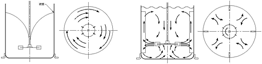 A. 中心插浸在低黏度且無擋板阻流之操作時,液體會產生打旋現象(圖D),攪拌速度越快則打旋越強烈,此種混合效率最低,通常系加裝擋板加以消除(圖E),在直立槽內加裝四個直立標準擋板組,板寬約槽直徑之1/10~1/12左右,由於進一步增加板寬時并未發現動力增加,故由輪葉動力消耗觀點看,此項寬度并不能視為標準之板寬,因為實驗證明發現,板寬范圍有助於流體上下打混,并消除渦流現象。但是板數增加時,動力消耗增加。當液體黏度增加時,對擋板需求層度隨之降低,板寬隨之減小,擋板可與槽壁保留適度之空隙讓流體穿過,而不至於產生滯留現象,更高黏度之液體則可采用斜角度方式安裝。